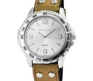 MONTRE EXCELLANC homme fond blanc, index des minutes bâtons et arabes de couleur argentée brillant fond blanc, chemin de fer des minutes et son bracelet cuir de couleur olive U