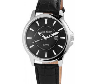 Montre Alain Miller pour homme fond noir index de ligne bâton de couleur argentée date automatique, étanche, et son bracelet cuir de couleur noir, Marque Alain Miller boiti