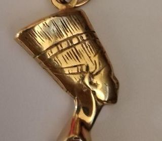 Vends médaillon buste Néfertiti année 1990, bien conservé. Très belle imitation or, dimension 2 cm, 2 petits éclats (photo).