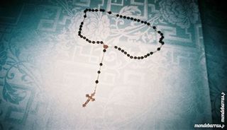 Chapelet ancien avec boules bleues marine Peut être en bois (buis) Chaine argentée de 46 cm Médaille intermédiaire et christ argenté Christ 4 cm 55 boules dont certaines
