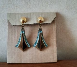Paire de boucles d'oreilles à pince en cuivre jaune. Fabrication française artisanale contemporaine. Hauteur : 7,5 cm
