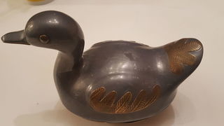 Très jolie petit canard en étain, recouvert partiellement d'un fiche couche de bronze, avec son corps, et son couvercle, représenatnt un coffert à bijoux. Longueur 16 centimètres
