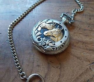 Montre de poche à quartz Aurore fondée 1887 Quartz tete de chevaux En vieil argent Livré avec sa chaîne Décoration tete chevaux Fonctionne pile neuve Des années 80, vintage