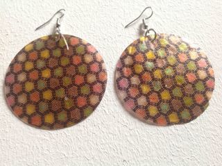 BOUCLES OREILLES FEUILLE NACRÉ impr. CERCLES Envoi Possible BOUCLES D'OREILLES AVEC FEUILLES DE NACRE, DE FORME RONDE DE 5cm DE DIAMÈTRE MOTIF IMPRIMÉ DE CERCLES DE DIFFÉRENTES