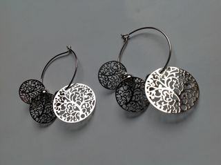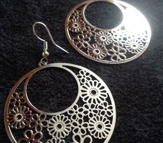 BELLES BOUCLES D'OREILLES ARGENTÉES DE FORME RONDE AVEC ANNEAU EN MOTIF D'ARABESQUES DE 3 TAiLLES DIFFÉRENTES. HAUTEUR MAX. AVEC ANNEAU : 4,5 cm. POUR LE RÈGLEMENT, JE FONCTI