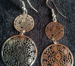 BOUCLES OREILLES ARGENTÉE DOUBLÉE FLEUR ETAT NEUF BELLES BOUCLES D'OREILLES DE COULEUR ARGENTÉES DOUBLÉES DE CERCLES REMPLIS de FLEURS DE DIFFÉRENTES TAILLES. DIAMÈTRE PETIT