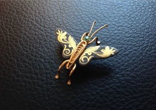 PAPILLON BROCHE DAMASCÈNE de TOLÈDE FLEURS AILES Envoi possible EN TRES BON ETAT PAPILLON AUX AILES DÉCORÉES... 2,8 cm de large par 3,8 cm long. POUR LE RÈGLEMENT, JE F