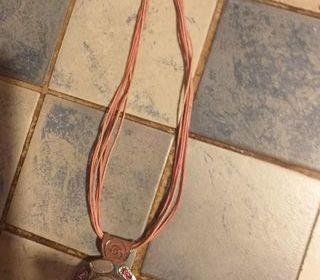 COLLIER AVEC MEDAILLON METALLIQUE AVEC BRILLANTS ROSE FLUO ET ROSE CLAIR TRESSE COULEUR ROSE LONGUEUR 36 CM DIAMETRE MEDAILLON 4.5 CM MARQUE PATRICE BREAL
