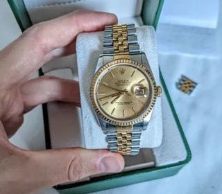 Montre Rolex datejust 36mm en or et acier de 1991. La montre est en bon état, rayures normales pour son âge. Le cadran champagne est en excellent état, aucune oxydation, les indexe