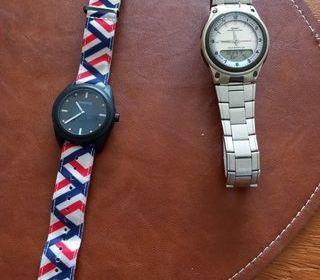 Montre unisexe avec bracelet en nylon à motif géométrique bleu/blanc/rouge, mis au point à partir de plastique recyclé et boîtier noir fabriqué à partir de filets de pêche recyclés