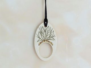 Collier/ Sautoir avec son Anneau Oval en Plastique Blanc et Lien Coton- Neuf * Collier/ sautoir avec son anneau oval en plastique blanc et son motif à feuilles ciselé en haut, ses
