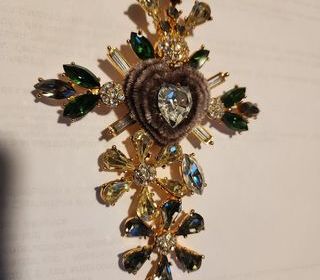 Vends Broche Croix LACROIX GM Strass Crystal + Multicolore, C?ur Crystal + entourage velours marron + pendant avec strass il y a aussi un crochet qui permettra de l'utiliser en pe