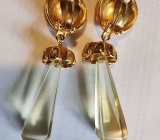 Vends BO Boucle d'Oreilles Clip Doré Godron LANVIN + pendant long translucide (forme pyramide inversée) Siglée LANVIN Dim 8 x 2 cm env vintage année 90 Parfait état Je vends