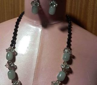 Boucles d'oreilles avec collier assorti femme Matières métal et plastique Forme boules et ovale Couleurs gris, noir, transparent et argenté Fermoirs boucles d'oreilles croc