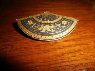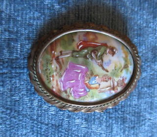 Broche médaillon , ancienne , en porcelaine de Limoges , ovale , sertie en laiton Scène galante 5,5 cm / 4,5 cm