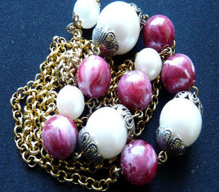 Collier perles couleur nacre et rosées chaînette dorée - Vintage années 90 Assez long Collier (80 cm), se porte bas. Un ensemble élégant de 3 paires de boules en résine couleur
