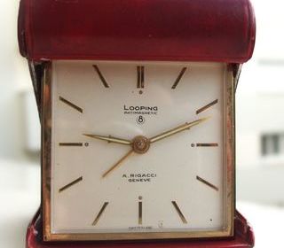 Ancien réveil de voyage pliable. Année 1958 Fabrication: horlogerie A. Rigacci à Genève/Suisse. Modèle LOOPING SWISS. Modèle pliable, habillé de cuir rouge. Mécanisme15 bijoux a