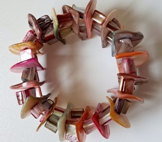 Bracelet neuf, avec plaques et perles en nacre de couleur. Diamètre minimum : 7cm Hauteur des plaques : 4cm Adapté à tous les poignets Annonce en ligne = article disponible Po