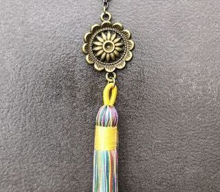 Je vends ce pendentif Bohème composé d'un pompon de fil de soie multicolore surmonté d'un médaillon fleur soleil en métal couleur cuivre doré Le pendentif mesure 10,5cm Le pe