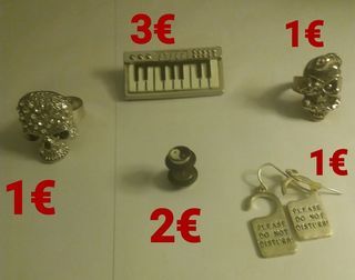 1 bague tête de mort (à gauche sur la photo) avec paillettes, ajustable : 1Euro(s) 1 broche clavier 4x2cm : 3Euro(s) 1 bague tête de mort avec serpent, ajustable : 1Euro(s) 1 bo