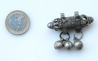 Très ancien pendentif en forme de cylindre à grelots Fin 19 ème début 20 ème En argent non poinçonné comme la plupart des bijoux ethniques de l'époque 4,5 cm sur 2 cm environ sa