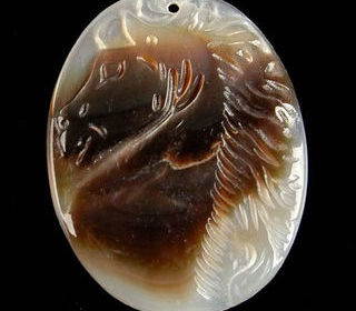 Pendentif, pierre percée ovale en nacre gravé d'une tête de cheval , très original Se porte avec un cordon 3, 5 cm sur 2,8 cm environ Envoi 2 euros