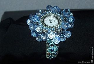 Montre femme très originale, très belle montre fantaisie marque « Collection IEKE Colleiten » bracelet argenté en fleurs émaillé, serti de strass et perles bleu, tour de