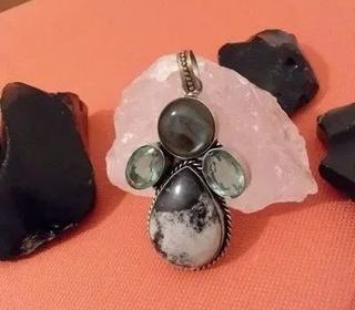 Pendentif argent en jaspe sésame labradorite et quartz vert, il mesure 5 cm de longueur, état neuf.