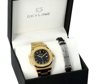 Montre Skyline tendance homme fond noir, boitier acier inoxydable, et son bracelet acier inoxydable de couleur dorée, date automatique + boite + bracelet cuir ref: 0404 marque
