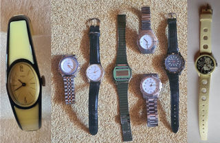 Vends lot de neuf montres qui fonctionnent à piles puces. Seule la montre Marilyn ne fonctionne pas La montre PAX (jaune et noire) : le bracelet est brisé. La dernière photo :