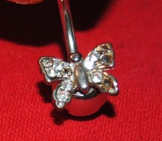 Bonjour, Je vous propose un Piercing pour le nombril, en acier chirurgical, représentant un papillon, serti de multiples strass. Une façon très chic et élégante d'embellir son