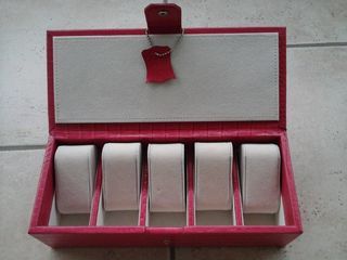 A vendre coffret en cuir doublé suédine pour rangement de montres avec 5 compartiments. Fermeture coffre avec bouton pression. Couleur rose État : bon état avec quelques ér