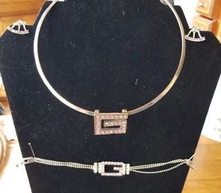 Parure collier bracelet boucle d oreille neuf argenté , rose et blanc en strass G 15 e