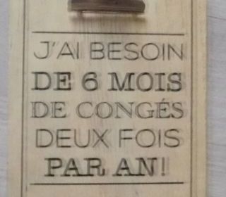 beau petit porte-documents afin d'écrire à plat pour feuille A5 avec une pince pour tenir les feuilles et écrit message humoristique 'j'ai besoin de 6 mois de vacances 2 fois dans