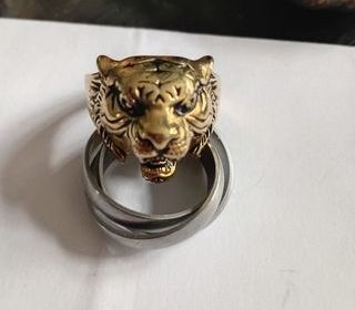 Vend deux bagues tête de tigre une argenté et l'autre doré taille 2,2 cm