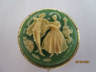 petite boîte pilulier ronde en métal doré, comprenant trois compartiments; le couvercle à une décoration de personnages CAMEE imitant l'ivoire sur fond vert. l'ensemble est joli