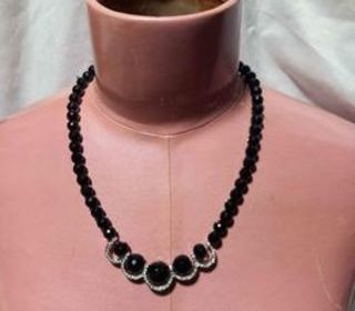 Collier femme Matières métal, plastique et strass Forme boules à facettes Couleurs argenté, blanc et noir En très bon état Dimensions approximative : collier détaché 52cm de l