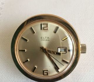 Pendulette de bureau dorée "presse papier" de marque ELTA, 17 rubis Circa 1960 - 1970 mécanique avec remontoir, trotteuse, date à 3 heures diamètre : 4 cm coffret d'origine bo