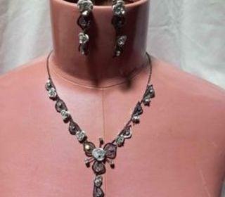 Boucles d'oreilles pendantes avec collier assorti femme Matières métal et strass Forme fleurs Couleurs argenté, gris et noir Fermoirs boucles d'oreilles clous Avec boîte c