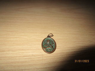 une médaille souvenirs de forme ovale , de Sainte Thérèse du côté face et de Jésus Christ, sur l'autre face. Etat bon malgré l'oxydation due à la matière et au temps