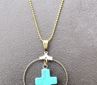Je vends cette croix en Turquoise naturelle montée en pendentif dans un anneau en acier doré Le pendentif mesure 4 cm suspendu La chaine en acier argenté maille boule est d'