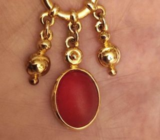 Joli pendentif métal doré vintage années 90. pierre centrale orange en résine de synthèse. petite oxydation niveau bélière presque invisible. c'est noté.