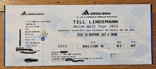 Bonjour, je vends ma place de concert pour Till LINDEMANN, leader chanteur de RAMMSTEIN, le 20 Novembre 2025 à l'ADIDAS ARENA de paris. Billet officiel, pas de contrefaçon; QR