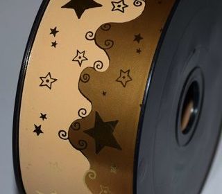 Ruban imprimé Cadeau Noel Fetes 55 m/m x 46 m neuf. RUBAN IMPRIME DE 55 M/M DE LARGE. Couleurs Or et Beige Longueur 46 m. Ruban Lucky imprimé 55 m/m neuf - Type Bolduc grande