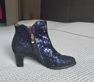 Bottine pour femme de couleur bleu nuit avec motifs floraux et fermeture éclair dorée sur le côté. Parfaite pour ajouter une touche élégante à votre tenue. Pointure 39, état neuf,