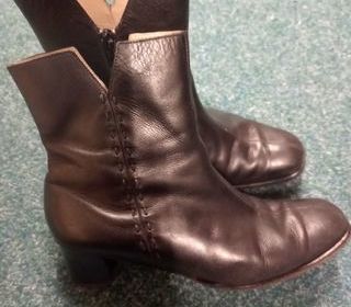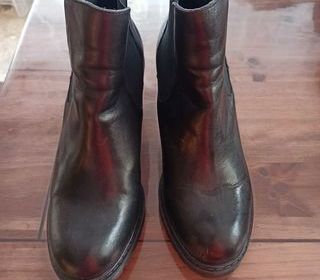 Paire de bottines tout cuir coloris noir, Hauteur : tige 16 cms, talon 5 cms (talonnette neuve) Bon état