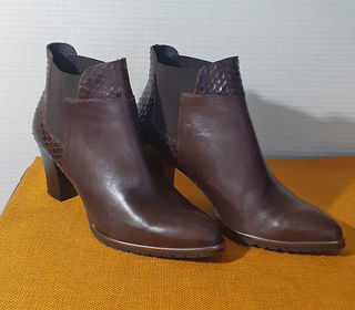 Bottines tout cuir, marque Perlato, état neuf. Pointure 39. Couleur marron uni et cuir travaillé effet croco sur l'arrière et sur le haut à l'avant. Semelle crantée caoutchouc.