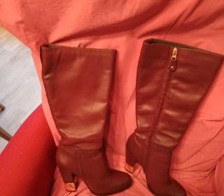 Vends bottes cuir bordeaux fermeture eclair jusq en haut 38 cm Talon doré 36 cm jamais portée Marque Bata valeur initiale 129 euros