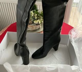 Bottes Noires en cuir marque SACHA talon 9 cm, tige avant le talon 38.5 cm, diamètre du haut 36 cm. Mise une fois. Vendu dans sa boîte d'origine avec emballage .. Prix d'achat 21