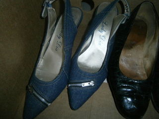 un paire talons 7 cm colori jean une paire vernies noires une paire ballerines kaki une paire bottines grises une paire ballerines blanches une paire ballerines noires 3 euros la